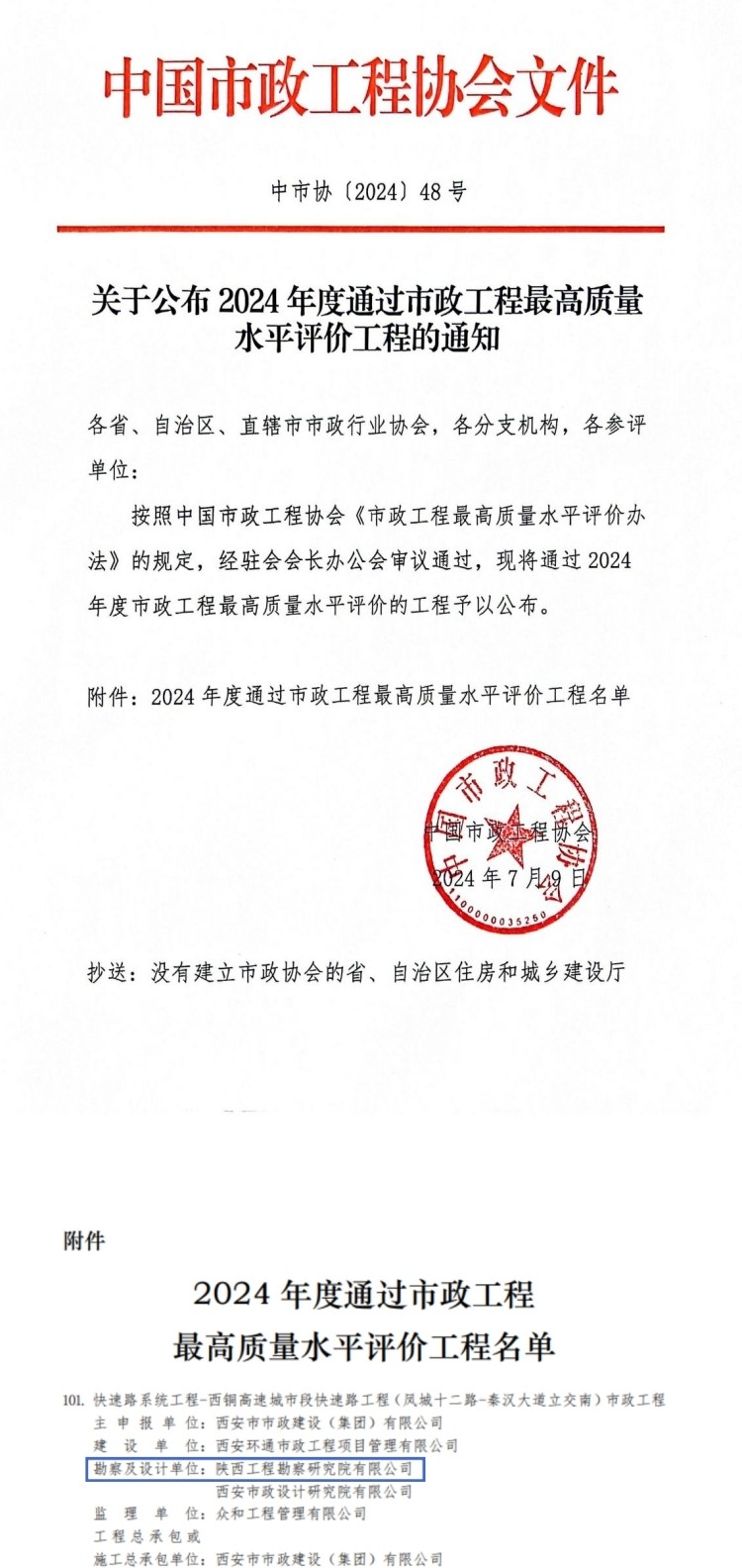 7月9日,中國(guó)市政工程協(xié)會(huì)公布了2024年度市政工程最高質(zhì)量水平評(píng)價(jià)工程名單,陜西工勘院參建項(xiàng)目名列其中,再次榮獲中國(guó)市政工程最高質(zhì)量水平評(píng)價(jià)。